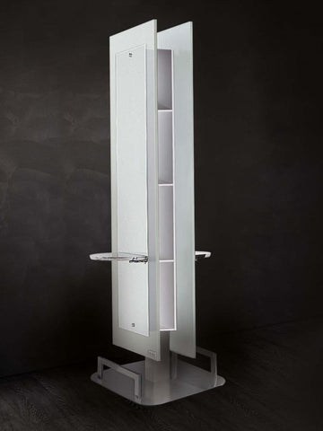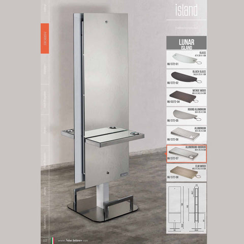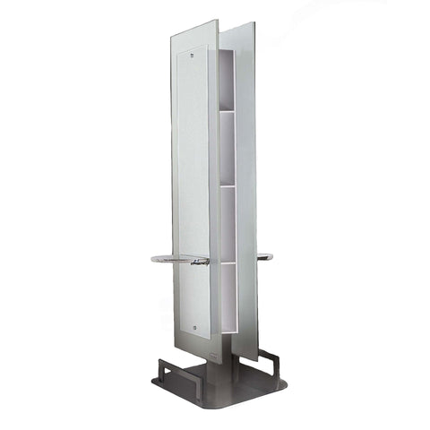 The Salon Ambience MI/054 Lyon Island Dual Styling Station is manufactured in Italy by Salon Ambience and is designed with quality and functionality at the forefront. The Lyon work unit has a rectangular frame in satin finished glass, outlining the smaller rectangular mirror in its center, and comes complete with a work shelf available in seven unique designs. The Lyon is installed on a metal frame, and includes free footrests and hairdryer holders.